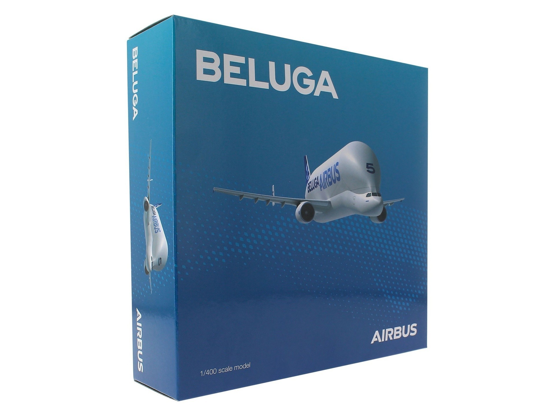 Das hochwertige Spritzgussmodell des BELUGA im Mastab 1:400 ist im Tampondruckverfahren bedruckt, spritzlackiert und mit einer Schicht aus Hochglanzlack veredelt. Es ist sehr detailgetreu, hat einen massiven, schweren Rumpf aus Metall, spritzgegossene Flügel und Leitwerk, ein Fahrwerk und einen Ständer. Verpackt in einer bunt bedruckten Airbus-Verpackung. Kein Zusammenbau nötig.