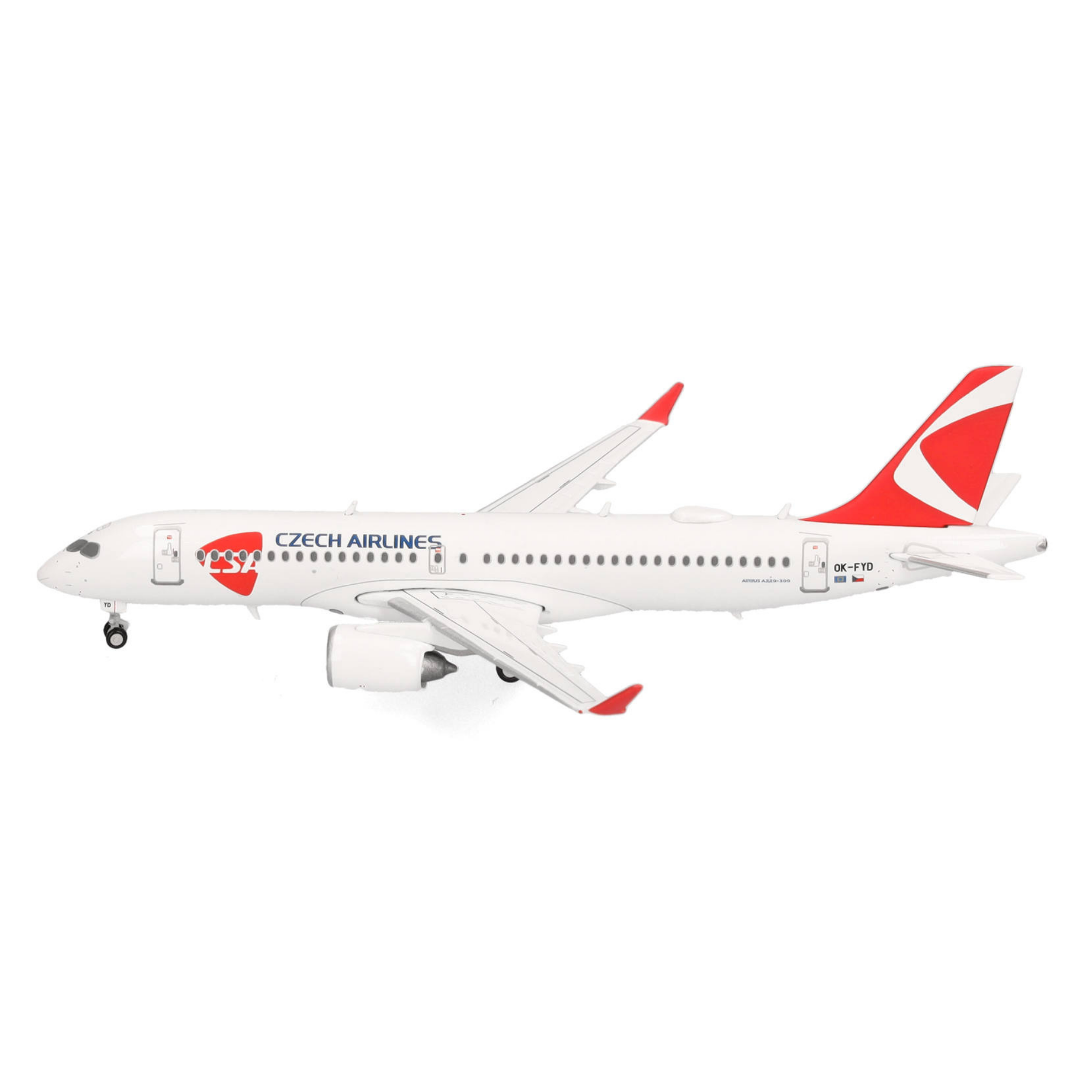2024 kam das Ende der CSA als selbstständige Fluggesellschaft. Nach finanziellen Schwierigkeiten hatte sie ein Jahr zuvor eine einzige A320 auf einer einzigen Strecke (Prag-Paris) im Einsatz. Für die 1923 gegründete CSA gibt es zumindest optisch noch eine Zukunft. Die verbleibenden A320 sowie vier neue A220, die seit November 2024 nach und nach eintreffen, werden vom ehemaligen Konkurrenten Smartwings unter der Marke und der Lackierung von CSA betrieben. OK-FYD ist das vierte und derzeit letzte dieser brandneuen Flugzeuge, das in Dienst gestellt wird und dieser einst großen und renommierten Fluggesellschaft eine, wenn auch kleinere, Zukunft ermöglicht. Nach den Ankündigungen in den Maßstäben 1:500 (Art.Nr. 538640) und 1:200 (Art.Nr. 573740) erscheint diese tschechische A220 nun auch als limitierte Neuheit im Maßstab 1:400. Ein kleiner Displaystand ist inklusive.